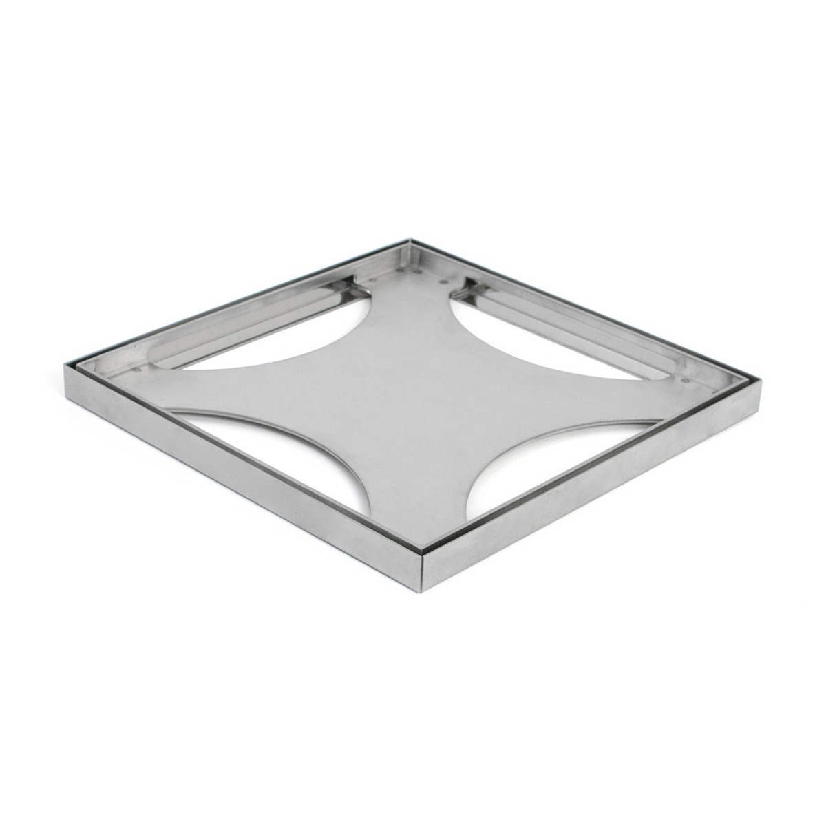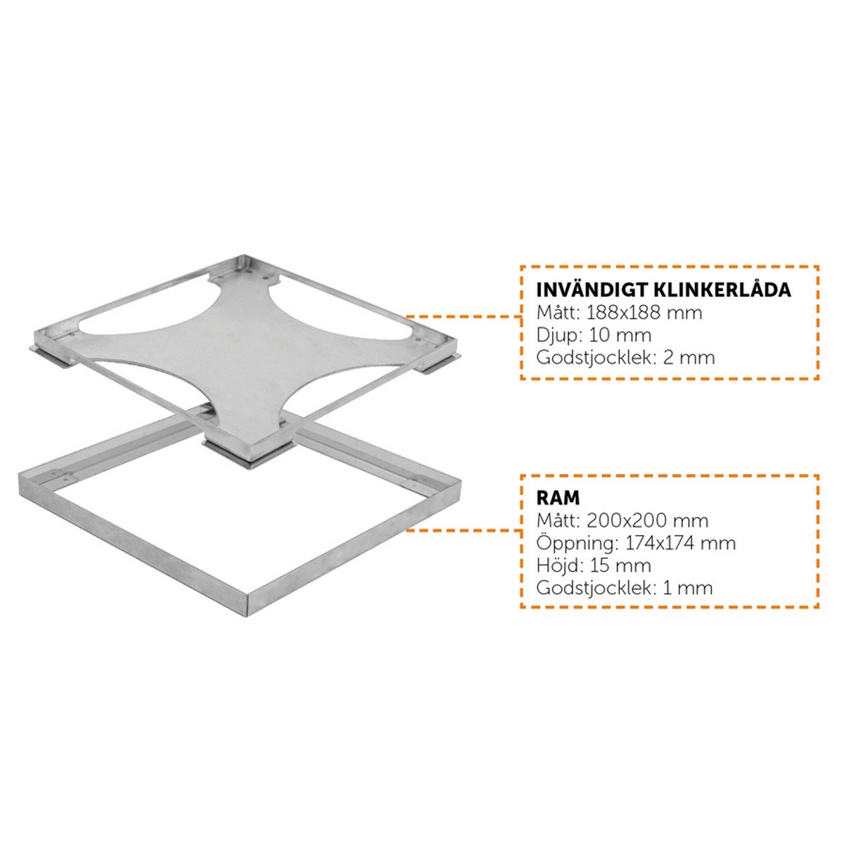 Stilren golvbrunnssil med ram för montering av klinker. Tillverkad av borstat rostfritt stål typ AISI 304. Består av två delar: Klinkerram och klinkerlåda. Godstjocklek ram: 1 mm. Godstjocklek låda: 2 mm. Ej syrafast.