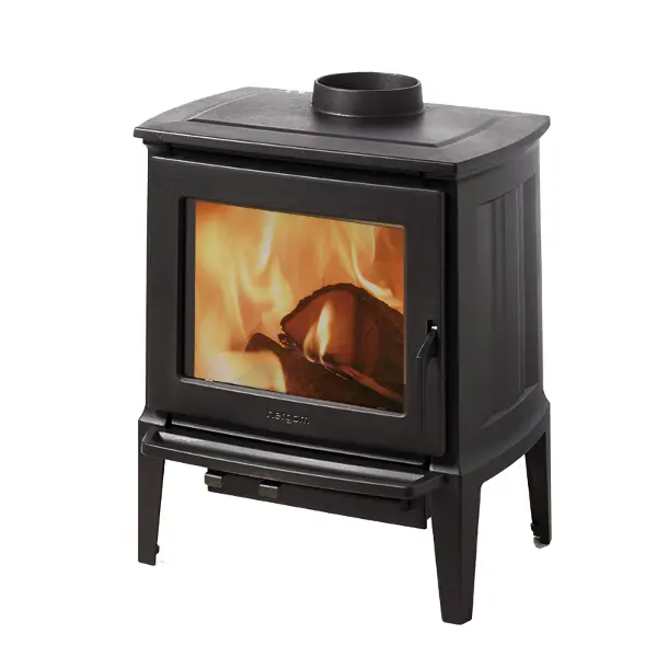 Klassisk gjutjärnkamin. Eldstaden är klädd med vermiculit, vilken är utbytbar. Kaminen går att ansluta till extern tilluft.