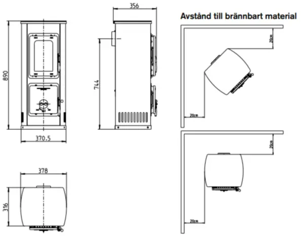 Vedeldad braskamin, med ett yttre hölje av emaljerad stålplåt i hög kvalité och med topp, luckor samt roster av gjutjärn . Eldstaden är klädd med utbytbar värmebeständigt material. Kaminen är avsedd för uppvärmning och trivseleldning i bostaden. Den har väl fungerande konvektion och värmer upp bostaden väl. Kaminen ska anslutas till rökkanal dimensionerad för rökgastemperatur med max. 350C.