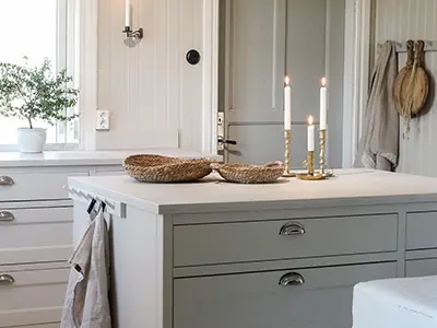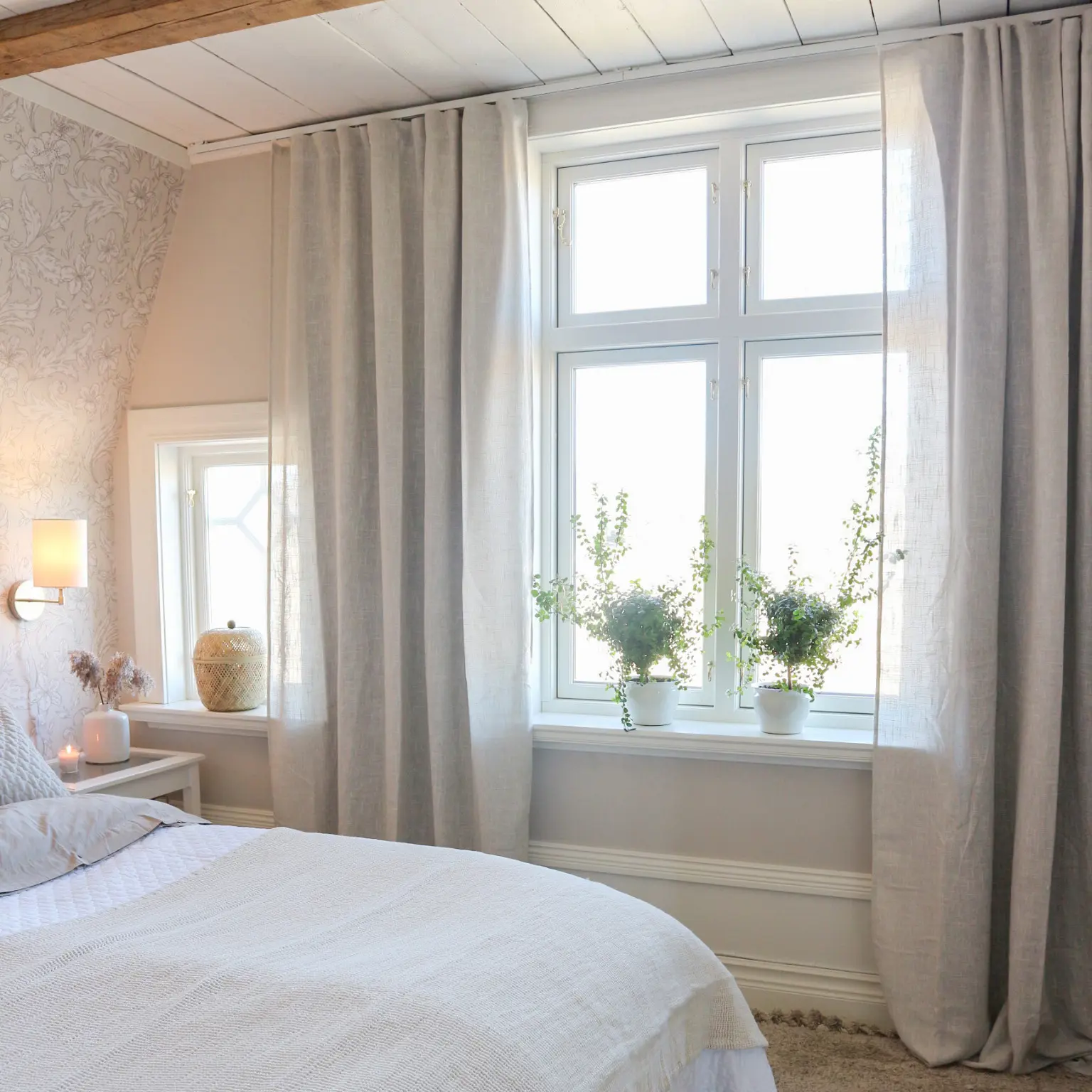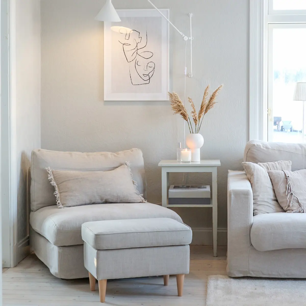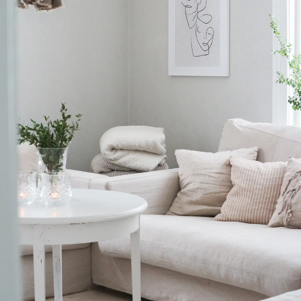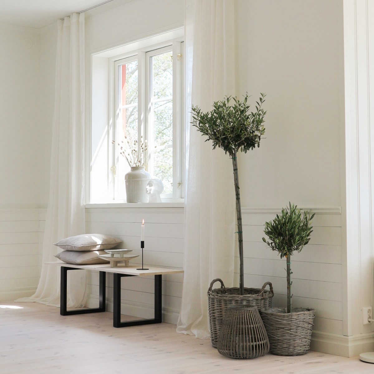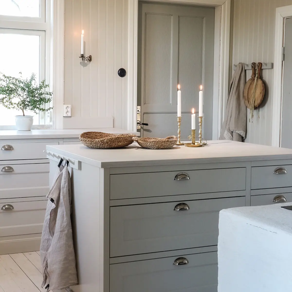 Sandras Antikgrå är en lugn vacker kulör som blivit ett populärt inslag i det svenska hemmet. Här har man valt att matcha den med beiga textilier och vitt. Sandras Antikgrå kan med fördel kombineras med Sandras Vita Linnen eller Sandras Antikvit. Köp provburk med valfri sandras kulör här!