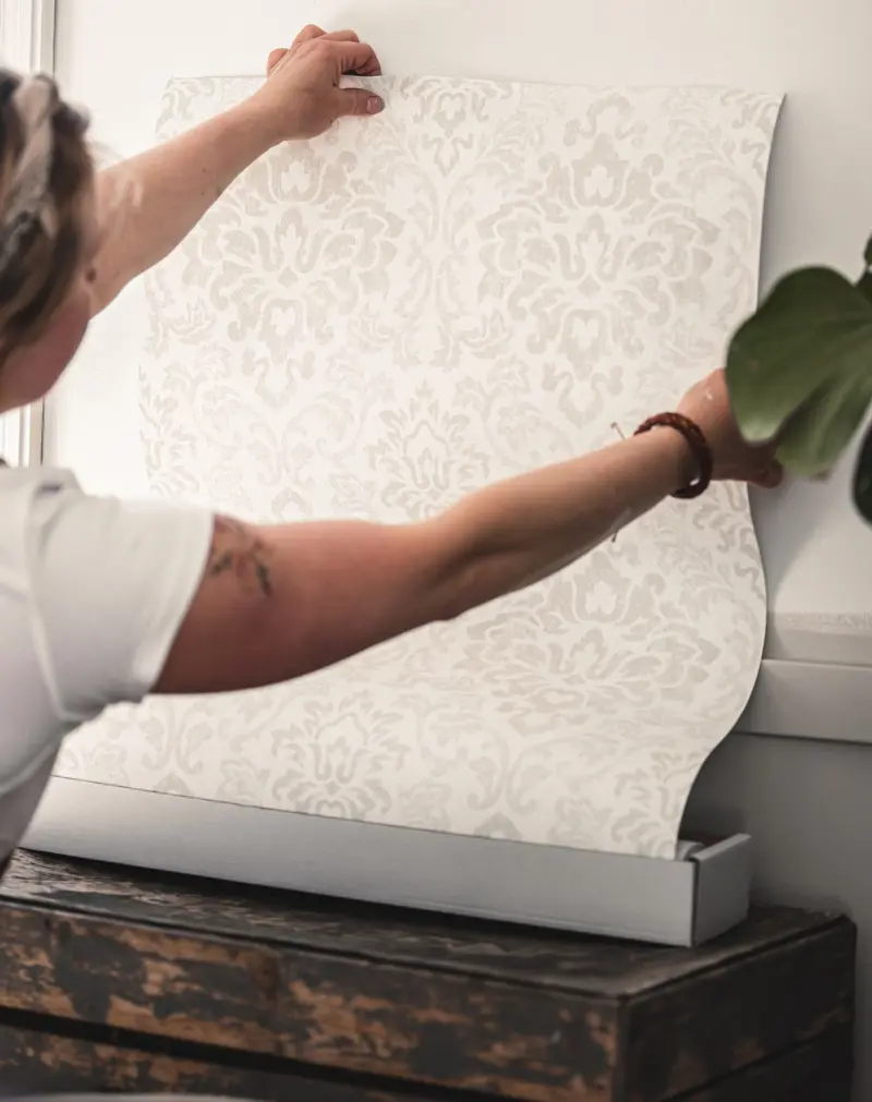 Förskjuten mönsterpassning innebär att man behöver göra en förskjutning av våden för att kunna matcha mönstret. Du behöver alltså putta tapeten uppåt (eller nedåt) tills du ser att mönstret matchar. På så sätt kommer mönstret att passa hela vägen. Det är enklare än vad det låter!