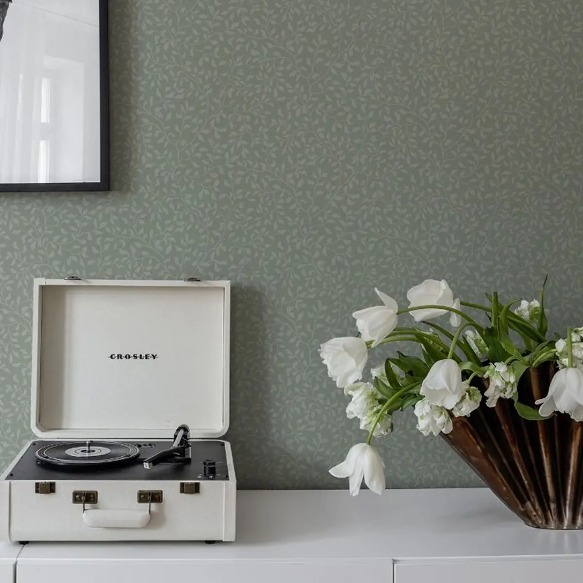 Tapeten Folke är ett elegant klättrande bladverk som påminner om blåbärsris. På avstånd upplevs tapeten som enfärgad men på nära håll syns de sirliga små grenarna.