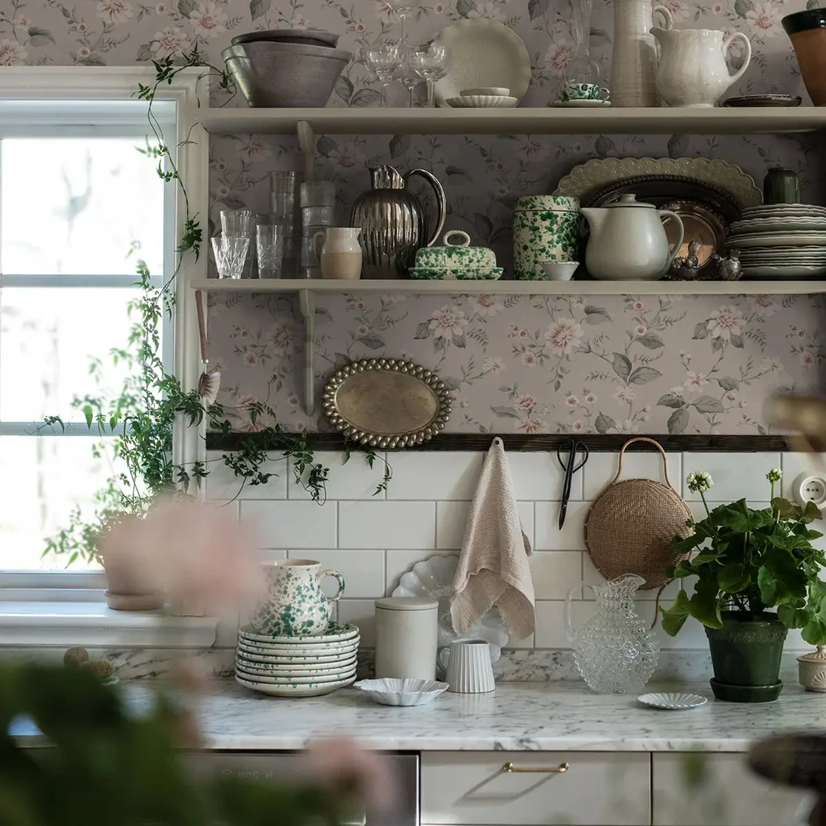 NLauras Cottage är en ljuvlig tapet med blomslingor. Originalmönstret är noggrant målat i akvarell på en botten med mjuk patina för ett naturligt, levande uttryck.
